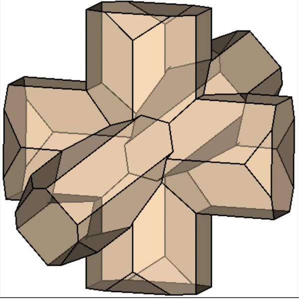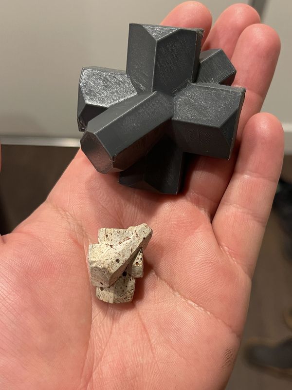 In this picture, a 3-D print of staurolite displays what the mineral would look like, if the mineral were perfectly formed in the earth.