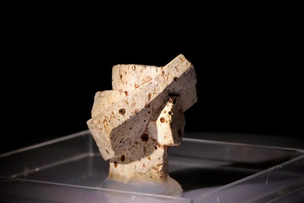 In this picture, one can observe the "spear" piercing through the staurolite mineral. The tiny brownish-red dots are the mineral garnet.